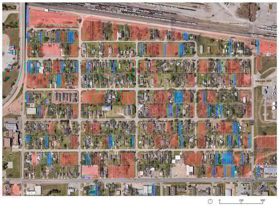 OKC, Shidler-Wheeler (census tract 1039): aerial view of the neighborhood with DUVL parcels more than 557.41 m2 (6000 sq ft, red hatch), and less than 557.41 m2 (blue hatch). Original Maps Data: Google ©2022 Airbus, CNES/Airbus, Maxar Technologies, U.S. Geological Survey, USDA/FPAC/GEO, Map data ©2022, https://www.google.com/maps (accessed on 20 August 2023), image adapted by the authors.