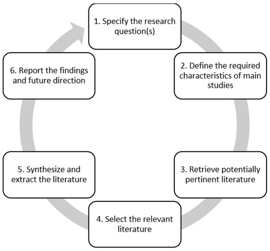 This study conducts a systematic literature review (SLR) as suggested by Webster and Watson [11] and Kitchenham and Charters [12]. An SLR offers an approach that uses data from existing document reports and previous research as secondary data. In this study, an SLR is employed to provide a more contextual, holistic, and complete understanding of inclusive and safe mobility in cities and communities. Thus, an SLR was employed in this study similar to prior studies [10,13,14], as it is suitable for exploring research works that are at an early stage, thereby providing preliminary information to help identify the gap in knowledge that needs to be addressed. As shown in Figure 1, an SLR typically comprises six main phases as defined in the literature [11,12]: (1) specifying the research question(s), (2) defining the required characteristics of main studies, (3) retrieving potentially pertinent works in the literature, (4) selecting the relevant works in the literature, (5) synthesizing and extracting works in the literature, and (6) reporting the findings and future direction.
