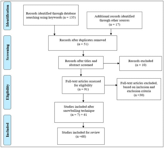 In the early stage of the search process, 152 potential sources were retrieved from online databases and from other sources such as policy websites (World Health Organization (WHO), European Union (EU) commission, and other websites), as seen in Figure 2, using the above-mentioned keywords. A total of 51 sources were found as duplicates and were removed. Hence, the total number of the remaining sources resulted in 101 sources, and their titles and abstracts were screened to be in line with the study area of inclusive and safe mobility needs of senior citizens. Next, 10 sources were removed, as the titles and abstracts were not fully aligned with the study area, resulting in 91 sources, which proceeded to the full-text assessment. In this phase, the author read all the sources and checked that their contents were related to the research questions in the first phase. At that point, no sources were removed. Then, the remaining 91 sources were assessed against the inclusion and exclusion criteria. Therefore, 30 sources were excluded, as these sources did not meet the inclusion criteria. This resulted in 61 sources, after which 7 sources were added based on snowballing, resulting in a total of 68 sources, as seen in Figure 2 and the References section of this article.