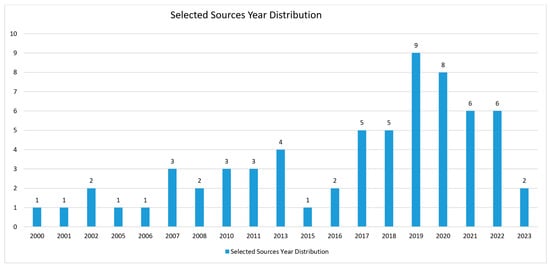 The findings in Figure 4 suggest that the majority of the included sources was published in 2019 with N = 9, followed by 2020 and 2021 with N = 8 individually. In 2022, N = 6 sources related to the mobility of senior citizens were published. The years of 2017 and 2018 both had N = 5, and 2013 had N = 4. The years of 2007, 2010, and 2011 recorded N = 3. The years of 2002, 2008, 2016, and 2023 recorded N = 2 sources, which is logical for 2023, as this paper was written within this year. Finally, 2000, 2001, 2005, 2006, 2014, and 2015 only had N = 1 source included. This finding suggests that only a few studies have been published in this important area, and this necessitates more research related to the mobility inclusion and safety of senior citizens.
