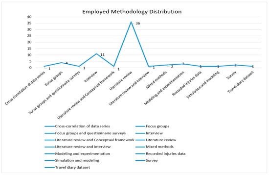 Figure 5 indicates that when analyzing the 68 sources, it was found that most of the sources included in this article adopted a literature review as the research method, with 39 sources using this method, followed by interviews, which were used in 11 sources, and focus groups, which were used in 4 sources. The findings in Figure 5 also depict other methods that were employed such as modeling and experimentation, which was used in three sources, and mixed mode and surveys, which were used in two sources. The remaining sources employed other research methods to collect data. This finding indicates that there are fewer studies on senior citizens’ mobility that provide evidence based on qualitative data via case studies, as seen in Figure 5. This current study will provide evidence based on an SLR as well as case studies from Norway, Canada, the USA, the UK, Sweden, and Northern Ireland.