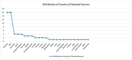 Figure 6 shows that there is a total of 24 countries of the “countries of published authors” in the selected sources. This finding suggests that most contributors to the study area related to mobility needs for senior citizens are mostly in the USA and Norway, with 16 sources, respectively. Four sources were published from Japan, Australia, and the UK. This is followed by Portugal, Poland, and the Netherlands, each with three studies included compared to the other regions, as seen in Figure 6.