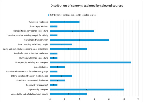 In addition, out of the 68 sources included in this study, Figure 7 summarizes the study contexts examined in the selected studies. The result suggests that most of the studies explored older people’s mobility and transport, age-friendly transport, and sustainable transport. Also, the finding shows that additional areas related to the mobility of senior citizens were researched such as transportation services for older adults, accessibility and safety for elderly people, and safety and mobility issues among older pedestrians. The result in Figure 7 also presents other areas or research domains examined. However, there are fewer studies [5,18] that present policy recommendations on how to improve the mobility of senior citizens. Similarly, there are limited studies that explore both the “inclusive” and “safe” mobility of senior citizens towards achieving age-friendly cities and communities.