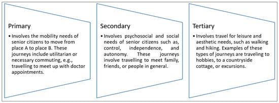 Also, this user group includes senior citizens who are visually disabled, have impaired hearing, and senior citizens who use wheelchairs [28]. The mobility needs and preferences of senior citizens should be considered by city administrators during the design of pedestrians’ roads, as this will contribute to greater accessibility for senior citizens and might increase their participation in outdoor and social activities [9]. This also has important implications for senior citizens aged over 65 who may experience multiple disadvantages as they become older, as they may decide to give up their driving license because they mostly feel pressured by health practitioners, family members, or an inability to deal with daily traffic conditions [3]. Thus, senior citizens need other alternate transportation modes. This is in line with the findings from a prior study, which suggested that the ability of senior citizens to drive or have access to a car may significantly impact their quality of life, particularly for those residing in rural areas [28]. As suggested by Salmela et al. [28], the mobility needs of senior citizens comprise primary, secondary, and tertiary needs, as seen in Figure 8.