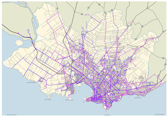Network of bus lines of the public transportation system in Montevideo (data from sig.montevideo.gub.uy), accessed on 23 September 2023.