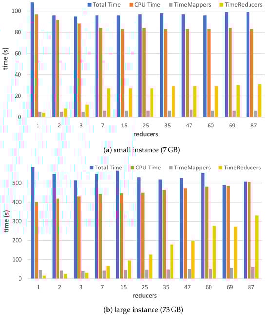 Figure 2 presents the results of the computational efficiency evaluation, reporting the four execution time metrics for a different number of reducer processes.