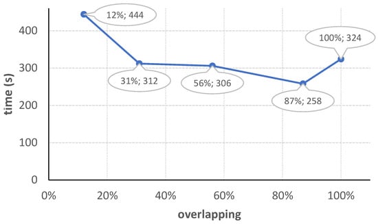 Execution time of the developed parallel MapReduce algorithm for different overlapping percentages.