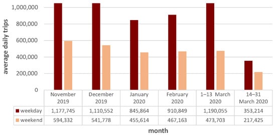 Time series of average daily trips before and after the sanitary emergency declaration (13 March 2020) in Montevideo, Uruguay (data from the period November 2019–March 2020).