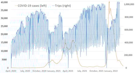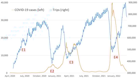 Regarding the evolution of public transportation usage during the COVID-19 pandemic, a negative correlation was found with the number of COVID-19 cases. The analysis identified four special events characterized by an increase in reported COVID-19 cases, as well as five distinct periods in the studied period, between April 20202 and May 2022. The negative correlation was particularly pronounced during the wave periods, namely the first wave (December 2020–February 2021) with a Pearson correlation coefficient of , the second wave (March–May 2021) with a Pearson correlation coefficient of , and the third wave (November 2021–February 2022) with a Pearson correlation coefficient of . These coefficients indicate that as the number of COVID-19 cases increased, there was a corresponding decrease in public transportation usage, and vice versa.