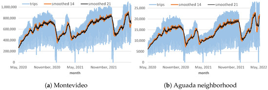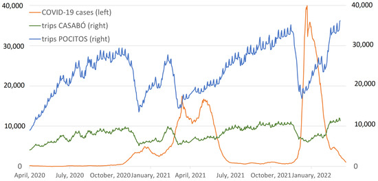 An example of the different behavior of citizens regarding the use of public transportation system is shown in Figure 13. Trips for two representative neighborhoods in Montevideo are presented: Pocitos, a high-income neighborhood having the maximum INSE value (9) and a high negative correlation with the number of COVID-19 cases; and Casabó, a low-income neighborhood having the minimum INSE value (0) and a low correlation. The poverty index is almost 30% in Casabó, whereas a negligible value is reported for Pocitos (2%) [43]. Accessibility indexes are also significantly higher for Pocitos than for Casabó [44].