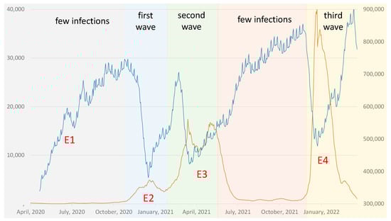 The second interesting aspect of the problem and the addressed case study is that the approach taken by the Uruguayan government in managing the COVID-19 pandemic diverged from that of other countries. Instead of implementing strict lockdown measures, Uruguay adopted a model known as ‘responsible freedom’ or ‘libertad responsable’ in Spanish. Under this model, voluntary quarantine was encouraged, but people were not mandated to stay at home and mobility was not limited. The government implemented a meticulous tracking system for infected individuals, along with random COVID-19 testing. Measures such as promoting the use of face masks, public awareness campaigns emphasizing social distancing and social responsibility, and a reasonable reduction in social activities were also implemented. This model proved successful in maintaining control over infections, with several days during the initial months of the pandemic registering zero active cases [15]. The first wave of COVID-19 was thus delayed until mid-2021 when the influence of tourism and the resumption of social activities contributed to the spread of the virus. The situation returned to a state of normalcy in August 2021, only to be disrupted by the onset of the second wave fueled by the Omicron strain in the summer of 2022. However, the vaccination campaign progressed rapidly, with more than 50,000 shots administered per day, and the country ranked among the highest globally in terms of the percentage of vaccinated population [16]. By March 2022, the situation had once again stabilized, leading to the official declaration of the end of the sanitary emergency on 5 April 2022.