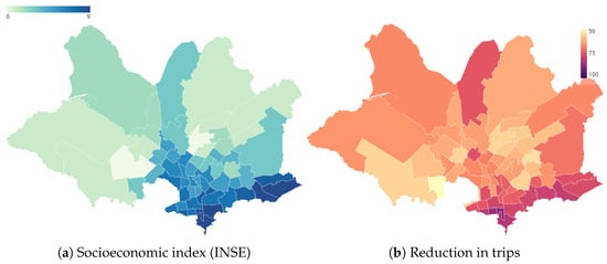 The choropleth maps in Figure 10 have a very similar structure, both with largest values of the reported indicators located along the southern seaside (in those neighborhoods where the wealthiest people live), and smaller values in peripheral neighborhoods of the city. The findings consistently indicate that residents in low-income neighborhoods had limited commuting options and were forced to rely heavily on public transportation, even in the hard circumstances of the COVID-19 pandemic. Individuals with low incomes often face limited mobility options and are more likely to rely on on-site manual labor jobs that are not compatible with the remote work paradigm. In contrast, individuals with higher incomes and greater purchasing power, living in neighborhoods with larger INSE values, significantly reduced their usage of public transportation, probably because they can afford other means of (private) transportation and/or they can perform their work from home.