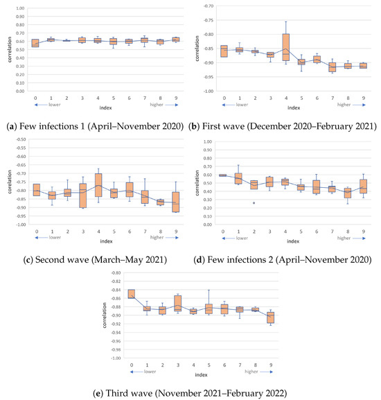 Figure 12 reports the Pearson correlation coefficient between the number of trips and the socioeconomic level of neighborhoods in Montevideo for the five periods studied. A consistent trend is detected for the three outbreak periods (waves), where the Pearson correlation coefficient was closer to (linear inverse relationship) for neighborhoods with the highest INSE values, whereas the correlation for neighborhoods with lower INSE values had smaller coefficients (between and ). In the two periods with few infections, no relationship was detected.