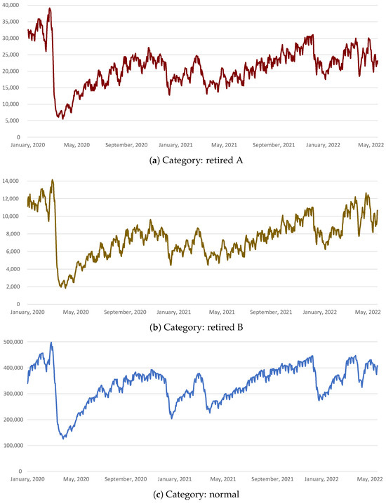 Figure 14 presents the evolution of public transportation usage for the three studied categories: retired A, retired B, and normal users (smoothed average values are reported).