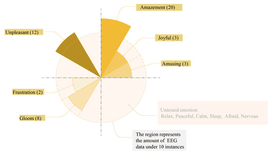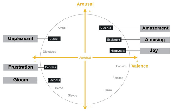 In our study, the well-established arousal–valence model originally proposed by Russell in 1979 [69] was employed. This two-dimensional model of emotion is commonly utilised for categorizing emotions. Building upon this, we applied a modified version of Russell’s model (Figure 5), introducing three positive emotions, ‘Amazement’, ‘Joy’, and ‘Amusement’, and three negative emotions ‘Unpleasantness’, ‘Frustration’, and ‘Gloom’. This adapted model served as the framework for our emotional classification.