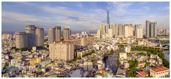 Vietnam has experienced dramatic and profound urban development as part of its wider socioeconomic transformation since the end of the 1980s [,,,,,,,,]. Official statistics suggest that the proportion of its residents living in urban areas increased from 20% in 1990 to nearly 40% in the year 2020 []. However, this figure remains still far below the regional average, and is lower than the one outlined in the recent policy documents, including the National Socioeconomic Development Strategy 2011–2020 and Resolution No. 06-NQ/TW on the planning, construction, management and sustainable development of urban areas in Vietnam until 2030, with a vision towards 2045, suggesting that continued urbanisation is inevitable [,,,].