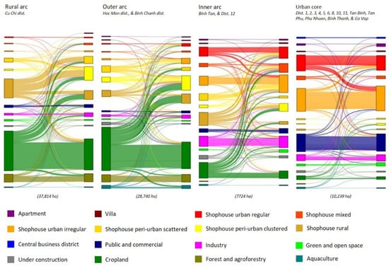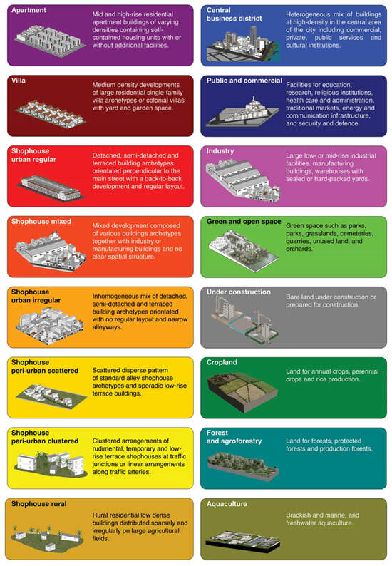 Both aforementioned studies could only detect binary urban growth. Because of the resolution limitations of the utilised Landsat series imagery, they were not able to distinguish further subclasses of built-up development or individual archetypes of morphological, functional, and socioeconomic features, which are critical for understanding urban transition processes and of practical planning and management relevance. Figure 6 graphically depicts the definitions of the dominant UST groupings observed in HCMC.