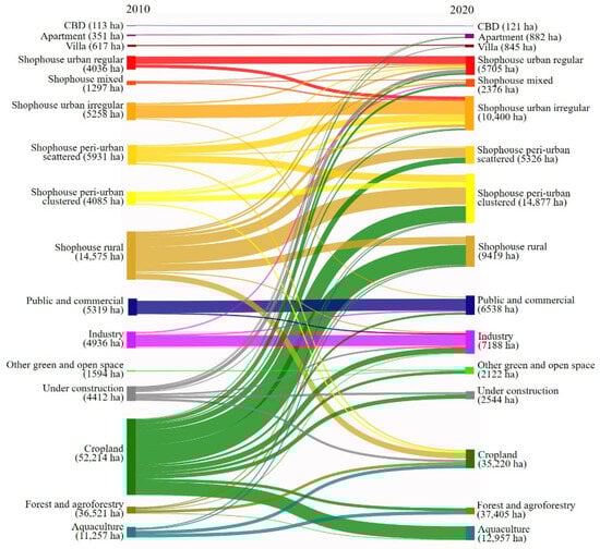Explaining and monitoring rapidly changing cities is a difficult endeavour. To further quantify the urban change, Figure 10 visualises the city-wide block level transitions and gross gain and loss of the main quantified UST from an initial state in the year 2010 to the year 2020. The width of horizontal flows corresponds proportionally to the sum of land transition. For readability, and to reduce visual confusion and exclude unnecessary information, we set the transition threshold value to 180 ha to exclude smaller changes between USTs. The chart highlights 215 flows between the 16 main groups. All in all, our analysis presents an urbanisation structure in which expansion as peri-urbanisation was dominant, while infilling and densification of irregular areas is also seen.