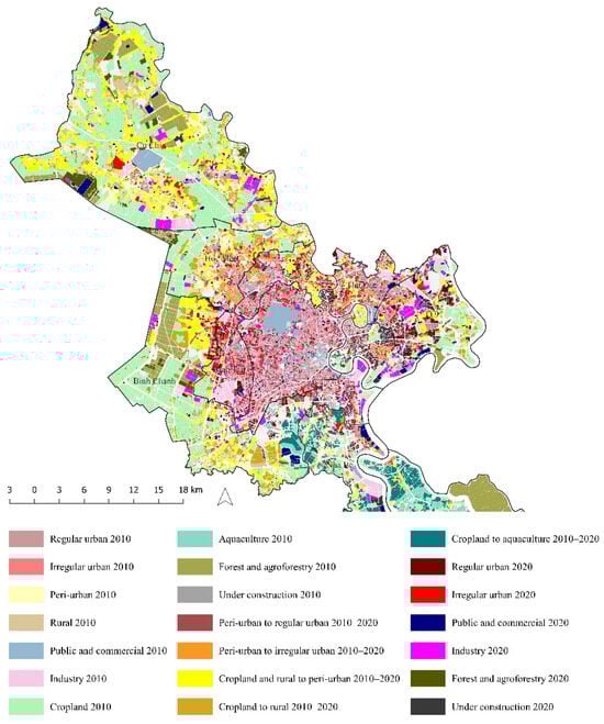 Highlighting the recent urban development directions, Figure 7 shows the spatial distribution of the dominant 16 UST groups in both 2010 and 2020.