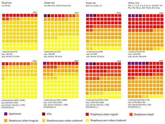Waffle charts illustrating the changes in the residential mix between 2010 and 2020 along the northwest development corridor of Ho Chi Minh City. Each cell within the individual 10 by 10 grid represents 1%, whilst the number in brackets indicates the percentage share of residential area to total area. RLCR/RPGR is the ratio of Residential Land Consumption Rate to net Residential Population Growth Rate between 2010 and 2020. This corridor reveals a monocentric structure. Population increased along this development corridor in absolute terms by 1,024,300 persons, excluding the urban core growth of 257,470 persons.