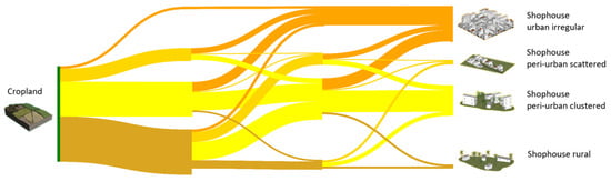 Our results highlighted that, by 2020, over 6200 ha of cropland was transformed into plot-by-plot organic shophouse peri-urban areas. In addition, the densification of over 8000 ha of former rural areas resulted in them being reclassified as peri-urban by 2020. These transitions bear a remarkable similarity to the process coined plotting urbanism by Karaman et al. (2020), who used the term to describe such incremental and piecemeal rural–urban changes []. While Karaman et al. (2020) often provided illegal examples of such peri-urban expansions, in the context of HCMC, enforcement of plans, and regulations for these developments, were widely undertaken in a relaxed laisser-faire or arbitrary manner in order to promote or at the very least not disturb the provision of self-built affordable housing to the growing population and inflowing lower income migrants [,]. Providing the examples of one-story buildings in Lagos, Nigeria, apartment buildings in Istanbul, Turkey, and high-rise tower blocks in Shenzhen, China, Karaman et al. (2020) highlights, in detail, that the dominant residential archetypes for plot-by-plot development vary globally and are highly dependent on the historical and cultural context of the location []. In the case of HCMC plot-by-plot development is seen within our shophouse archetypes.