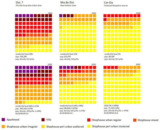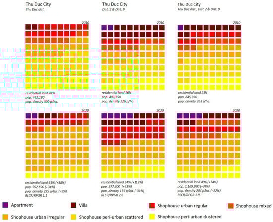 In the second step, we focus solely on the residential USTs, using waffle charts to present their spatial proportions in both 2010 and 2020. By utilising official population data for the two years, we additionally calculate four key indicators: the residential land consumption growth rate (RLCR); the net residential density, by projecting the population data purely to the residential area of each district; the residential population growth rate (RPGR); and finally the ratio of RLCR to RPGR as an indicator to describe more sprawling or more compact density development pathways [].