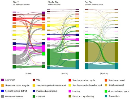We understand the classified USTs at the urban block level as the individual spatial entities that define the functional spatial configuration of the HCMC urban region. Against the background, we attempt to identify parallels and differences between the urban configurations and development patterns in both 2010 and 2020, respectively, using the initial step two indicators: The spatial proportion of USTs in each year and the spatial share of UST change between 2010 and 2020. To present and communicate both indicators, we employ alluvial flow charts.