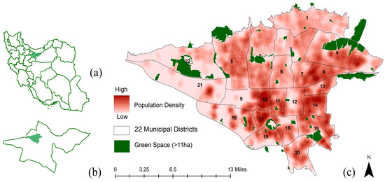 (a) Tehran Province location in Iran, (b) Tehran city location in Tehran Province, and (c) population density and urban green space distribution in Tehran.