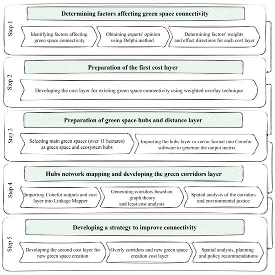 The primary objective of this study is to evaluate the connectivity of urban green spaces and the flow of ecosystem services in Tehran, with a particular focus on urban environmental justice. This evaluation is designed to estimate the extent to which urban residents benefit from the ecosystem services provided by green spaces. The relationship between connectivity and the utilization of ecosystem services is complex and nonlinear, influenced by various urban social and environmental factors [43]. To analyze connectivity, we used graph theory and the least-cost model, with the assumption that 100% structural connection represents an ideal scenario. Our assessment of connectivity included considering several factors increasing or decreasing resistance to (1) the flow of ecosystem services between existing green spaces, and (2) developing new green spaces. As a practical tool for urban governance, our study presents a network model to enhance connectivity and pinpoint areas that require targeted intervention. As outlined in Figure 2, this research was conducted in five steps.
