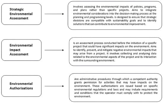 Land use suitability analysis is a very important task faced by urban planners and managers, with the aim of identifying the most appropriate spatial pattern for future land use [16,17] according to specific requirements, preferences, or predictors of some activities [18]. It has also been applied in a variety of situations, such as the definition of land habitats for animal and plant species [19,20], geological affordability [21,22], landscape evaluation and planning [23,24], and environmental impact assessment [25]. Methods of land use suitability analysis can be categorised as overlay mapping methods [26]. Environmental assessments can be divided into two categories: strategic analysis and environmental impact assessment. Both types are potential tools for policy making, although they have different areas of application. Strategic environmental assessments aim to facilitate the consideration of potential environmental impacts in strategic decision making and are therefore applied to plans and programmes [27,28]. On the other hand, environmental impact assessments are used to evaluate the impact of a proposed project [29,30]. Environmental assessments therefore have different areas of application, but both aim to contribute to sustainability. Environmental assessments are related to potential aspects, and therefore, it is important to examine the actual territorial conditions; environmental assessments of plans, programmes, and projects are closely related to Environmental Authorisation. Environmental Authorisation finally regulates the impacts of industry and promotes the concept of sustainability in industrial activities [31,32]. Figure 1 schematises what has been defined.