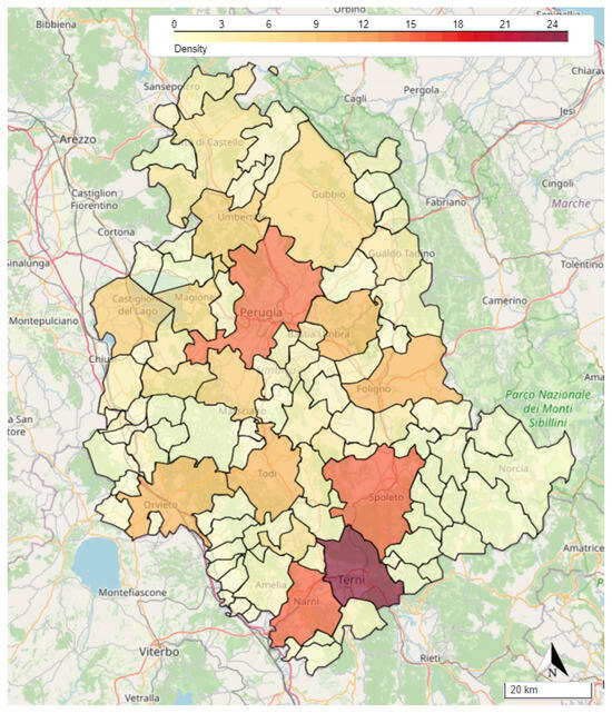 The visual representation of municipal boundaries provides a clear indication of the spatial distribution of geolocated industrial activities. In order to evaluate the territorial distribution, a new map was created. The map uses different colours to represent the specific numerical density of industrial activities. Figure 3 shows a section of the map from which it can be seen that Terni has a higher density of industrial activities subject to Integrated Environmental Authorisation and Unique Waste Authorisation, followed by Narni, Spoleto, and Perugia. Therefore, these municipalities require greater consideration in the decision-making process for new industrial activities.