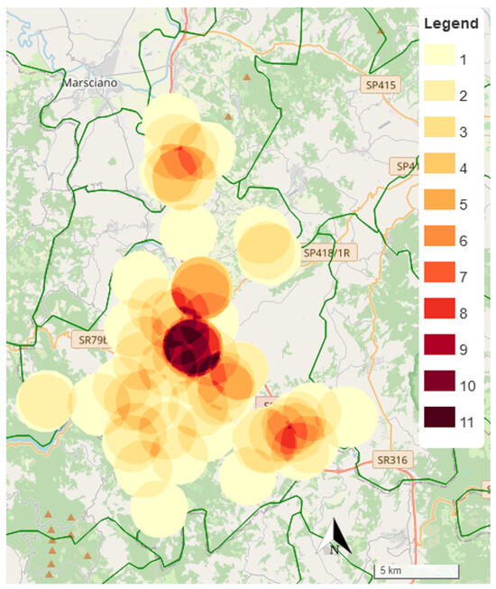 In Figure 5, the total number of intersections is shown by plotting the buffers on a chromatic scale. This helps to identify areas where multiple buffers intersect. Equation (1) was used to identify the number of intersections, where i and j represent the buffers. To assign a value to repeated intersections, the was calculated for each point of the examined area. Within each buffer, different sections of different colours are created, taking into account the distance with respect to the coordinates of the centroid: