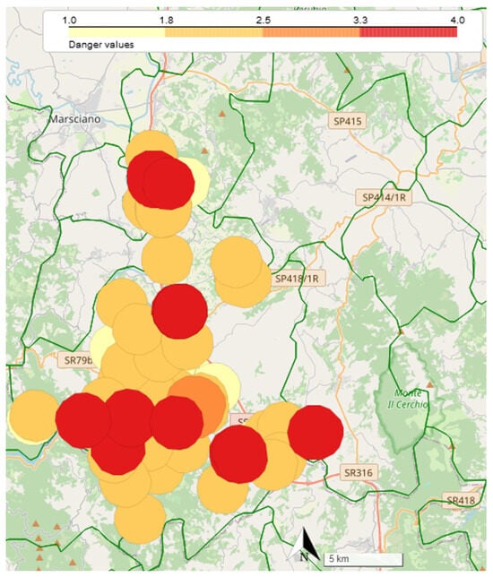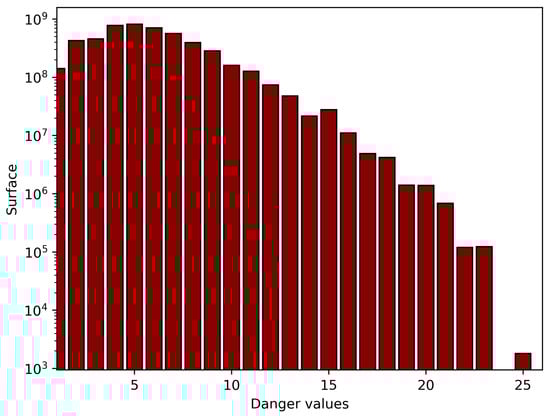 Figure 9 shows the histogram of the danger values based on the function of surface area in square metres; this plot is useful for a deeper analysis of the global impact and to analyse the precision and usefulness of the overlap. The area scale is logarithmic for better visualisation. The maximum value of the affected area corresponds to a danger value of five, which is relatively low considering that the maximum danger value of an individual buffer can reach four. As also highlighted in Figure 7, the maximum value of reached 25 and affects a relatively small area when considering the municipal extension. However, there are large areas affected by high danger values. It can be observed that, in general, the danger values tend to increase as the area affected decreases.