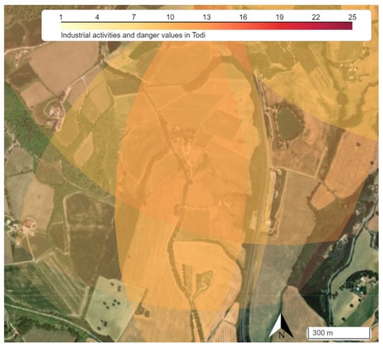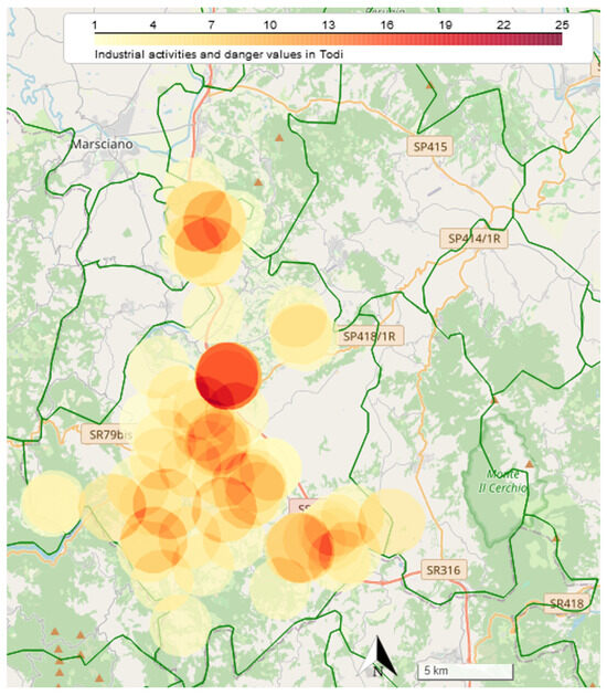 However, it is important to remember that each buffer should be assessed according to its specific typology. Industrial activities have varying impacts on the environment, and it is important to assign danger values to each type. Initially, three danger values were defined, each associated with a specific type of Environmental Authorisation: Integrated Environmental Authorisation, Waste Unique Authorisation, and Environmental Unique Authorisation. However, a fourth value was necessary because intensive farming is included in the Integrated Environmental Authorisation but can be considered separately due to its high level of pollution. The permitting process includes a territorial analysis not only of activities that require Environmental Authorisations but also of other activities such as mining, purification, and radio and video systems. To achieve a comprehensive categorisation, we added a fourth danger value and extended the categorisation to other activities that regional instructors have deemed important for the permitting process. To summarise, value 1 is associated with industrial activities that require Environmental Unique Authorisation and other low-risk activities that, when considered together with industrial activities, are significant, such as radio and video systems. Value 2 has been assigned to activities that pose a higher degree of environmental risk than level 1. This value can be linked to activities such as mining or non-intensive farming, which have significant effects on the environment. Industrial activities that produce pollution and are subject to periodic checks on waste treatment or industrial emissions of hazardous substances are assigned a value of three. This includes activities such as waste treatment and large-scale industrial operations that fall under either a Waste Unique Authorisation or an Integrated Environmental Authorisation. These authorisations are often closely linked due to the high degree of pollution associated with both. Value 4 is associated with activities that require specific analyses of potentially polluting or hazardous substances produced by their operations for authorisation purposes; for example, intensive farming or industries that emit carcinogenic or toxic substances. It is important to note that these values should not be considered empirical. Rather, they should be seen as a preliminary assessment of the hazard levels in the cumulative impact assessment. This assessment is based on discussions with regional experts and is consistent with the level of complexity of the permitting process. As a result, they represent an important tool for risk quantification and cumulative impact assessment based on knowledge of the areas and industrial activities. Table 3 defines the danger values associated with the industrial activities located in Todi.