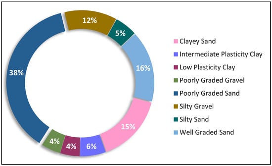 The current research examines soil properties in Andhra Pradesh state, specifically focusing on samples collected from core and non-core road networks, as shown in Figure 1. A comprehensive range of critical parameters was collected to generate robust and reliable data models, such as particle size distribution, Atterberg limits, maximum dry density, optimum moisture content (OMC), and CBR values. To mitigate the negative impacts of multicollinearity on data quality, data preprocessing was conducted, involving the exercise of a multicollinearity check to comprehend the interdependencies among independent variables. In particular, the Karl Pearson Correlation was applied in conjunction with the variance inflation factor (VIF) for each independent variable, where the VIF indicates how much the variance of the estimated regression coefficient is inflated due to multicollinearity. A VIF value exceeding five suggests the presence of multicollinearity. The soil type, PI, and MDD parameters were selected for input into the data modeling phase, as they exhibited no multicollinearity. Additionally, box plots were developed to eliminate any outliers for the input and output parameters of interest. This led to the selection of 2191 samples for CBR value modeling after removing outliers from the CBR results of 2469 subgrade samples used in the study. The collected soil samples were of coarse- and fine-grained varieties and were classified according to the Indian Standard Soil Classification System, falling into eight distinct soil types (SW, SP, SM, SC, GP, GM, CL, CI), as illustrated in Figure 2. The laboratory-based determination of CBR values for each sample was performed using a soil compaction method by the ASTM D1883-16 Standard Test Procedure [34]. Statistically descriptive analyses of the soil properties collected in the database are detailed in Table 2, with accompanying frequency histograms presented in Figure 3.
