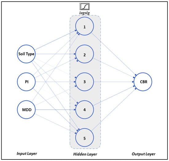 ANN has been used to address technical challenges by researchers working on complicated technical problems over the past decade. The ANN model may be built in a variety of forms, all of which are based on the same fundamental structure. A collection of input nodes, a single layer or layers of hidden nodes, and a collection of output nodes are all included in this [37]. A multilayer network with multiple transfer functions was used to determine the best ANN model to predict the CBR. The model’s accuracy in predicting the output is governed by the training function, transfer function, number of hidden layers, and number of neurons inside the hidden layers. A Multi-Layered Perception (MLP) Feed-Forward Back-Propagation mechanism, a log-sig (log-sigmoid) activation function, and a Levenberg–Marquardt (trainlm) learning function were incorporated to develop a suitable ANN model for predicting the CBR of the soil. Different combinations of the number of hidden layers and the corresponding number of neurons were tried to obtain a model with a higher R2 value and lower RMS error. One hidden layer with five neurons offered the optimum network structure for the inputs such as soil type, PI, MDD, and CBR as an output (3-5-1). Of the total data points, 70% were used to train the model, 15% were used to test the model, and the remaining 15% were validated using MATLAB r2022a software. The suggested ANN model architecture is shown in Figure 3.