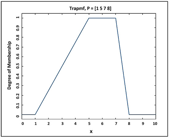 The membership functions are named after the curve’s geometry, such as triangular, bell-shaped, trapezoidal, and Gaussian membership functions [Equation (3)]. The developed ANFIS model was evaluated with all membership functions, and the trapezoidal membership function (trapmf) was found to give the best results with the lowest RMSE value and was therefore used in the research. With four scalar parameters to define its curve: a, b for feet and c, d for shoulders, trapmf forms the shape of a truncated triangle, as shown in Figure 4.