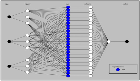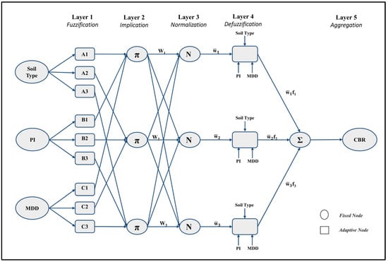 A five-layer architecture usually depicts a typical ANFIS network, as represented in Figure 5. In references such as Jang [38], extensive documentation for ANFIS is available (1993). The adaptive neuro-fuzzy inference system considers three inputs, soil type, PI, and MDD, and an output, CBR. Below is a brief description of each layer’s functions in the ANFIS.