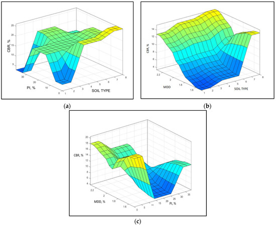 Figure 10a depicts that the predicted CBR value with a PI value between 0 and 10 is highest for soil types SP and SW (7 and 8) and lowest for the soil types CI and CL (1 and 2) with high PI values and a moderate CBR for GM, GP, SC and SM (3, 4, 5 and 6). A further increase in the PI value reduces the CBR value significantly. From the Figure 10b it can be observed that soil type SP and SW with higher MDD have the highest CBR value. Whereas soil types CI and CL (1 and 2) and GM, GP, SC, and SM (3, 4, 5, and 6) provided the lowest and moderate CBR values, respectively, the MDD value was reduced. The combined result can be observed in Figure 10c, wherein the highest CBR value is obtained for a lesser PI value and a higher MDD value. Figure 11 represents variation of the CBR with changes in (a) soil type and PI, (b) soil type and MDD, and (c) PI and MDD.