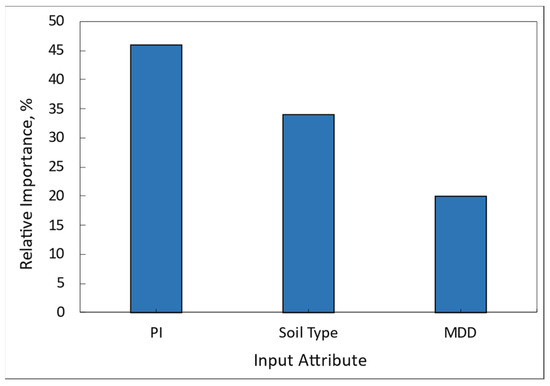 Sensitivity analysis is a critical tool that can determine the most influential parameters affecting the California Bearing Ratio (CBR) value. Its primary purpose is to investigate the importance of imprecision or uncertainty in model inputs, thereby enabling decision-makers and modelers to identify key variables that can substantially influence the values of a particular output variable. By measuring the effect of changes in model input values on model output values, sensitivity analysis can help to improve the accuracy and robustness of CBR predictions. In practice, it is commonly observed that only a relatively small number of input variables significantly affect the values of a particular output variable. As such, sensitivity analysis techniques can be used to calculate a parameter known to be of input importance. The input importance of each parameter can then be evaluated and ranked to identify which variables are most significant. In this study, multivariate sensitivity analysis was carried out based on Principal Component Analysis [39]. Figure 12 shows the input importance of different parameters. The results of the analysis suggest that the PI changes are a highly significant factor and play a major role in affecting the CBR, with a relative importance of 46% [40]. Soil type is ranked second at 34%, while maximum dry density (MDD) is ranked last with a relative importance of 20%. The low impact of MDD on the CBR suggests that it is less influential than other parameters and should be given less weight in CBR predictions [41].