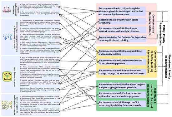 In each of these phases, engagement actions and observation occurred, leading to either the confirmation of the effectiveness of known strategies from the literature or the consolidation of lessons learned and an eventual synthesis into strategies that could be replicated and tested further in similar contexts. The last step of the methodology was to synthesise and cluster these co-creation strategies into a set of recommendations to support co-governance, communications and capacity building, and motivational aspects. Recommendations were also highlighted based on policy and place-based priority areas.
