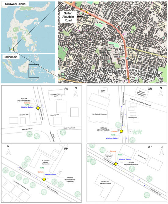 The study employed four different roadside environments, namely paved (PA), gravel (GR), paved with a pedestrian walk (PP), and unpaved (UP), along Sultan Alauddin Street to cover a broad spectrum of urban pollution situations. The selection of these environments was based on their ability to represent a wide range of traffic density and urban activities, which are known to have an impact on particulate matter levels. This ensures that the dataset is diverse and representative. The sampling was carried out in three distinct periods: morning, afternoon, and late afternoon. Each period was repeated three times to enhance the reliability and validity of the data collected. This approach was aimed at capturing the dynamic character of urban pollution, which can vary significantly over time due to factors such as traffic patterns, human behavior, and weather conditions. The details of the sampling site are shown in Figure 1 and Figure S1.