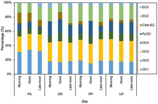 Since carbon components are the major constituents of various size fractions of PM such as PM2.5, PM10, and Total Suspended Particles (TSP), they are commonly used as an indicator of the source of emitted aerosol particles [18,19]. The OC/EC and char-EC/soot-EC ratios are frequently used to identify the major sources of PMs [20,21]. In several reports, PyOC (Pyrolysis)/OC4 and soot-EC/TC (total carbon) ratios were used to differentiate the emission sources from biomass and fossil fuels [22,23]