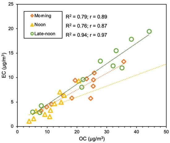 Soot-EC was notably higher than char-EC, particularly during the morning and late afternoon when the number of vehicles was higher than at noon [39,40]. This is also related to the characteristics of the sites, which were significantly impacted by vehicle emissions, as indicated by the ratio (char-EC/soot-EC) being less than one. The OC/EC ratio in this study was comparable for the entire period and locations, ranging within 1.67–2.87, suggesting that OC and EC were emitted from the common sources such as vehicles emission. This is consistent with findings reported in a previous study by Demir et al. [41] who found low OC/EC ratios, pointing to diesel emissions as a major contributor. Our findings also aligned with the data reported by Shandilya and Kumar [42], who emphasized the variations in EC emissions from buses fueled by different sources, indicating a significant correlation between the type of fuel and carbon emissions. Our findings were also confirmed by the strong correlation between OC and EC as shown in Figure 5. These Pearson correlation coefficients (r) for carbon were 0.89, 0.87, and 0.97 in the morning, noon, and afternoon, respectively. The main sources of carbon in this study appear to be from emissions derived from vehicle engines from Sultan Alauddin Road. The higher level of EC detected during peak hours emphasized the substantial influence of vehicular traffic, particularly from large vehicles as reported by Demir et al. and Yan et al. [31,43]. The ratio of POC/SOC (Table 4) during the entire period was 2.58 ± 1.70, indicating that fresh emissions were the main sources of the carbon component of the TSP [44]. Nevertheless, these data indicate that the proportion of SOC compared to POC varies during the course of the day. The morning period had the highest POC/SOC ratio at all locations, indicating a prevailing impact of direct emissions from morning traffic. Throughout the day, the lowest ratio was observed during the afternoon. This drop can be attributed to less traffic and enhanced air oxidation processes which promoted the creation of SOC. During the late afternoon, there was noticeable increase in the ratio of POC/SOC compared to midday. This increase may be linked to the increased traffic in the late afternoon (Table S2).