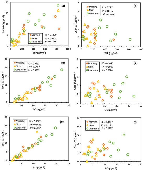 Correlations of (a) TSP vs. soot-EC, (b) TSP vs. char-EC, (c) OC vs. soot-EC, (d) OC vs. char-EC, (e) EC vs. soot-EC, and (f) EC vs. char-EC in Sultan Alauddin Street, Makassar city, South Sulawesi, Indonesia.