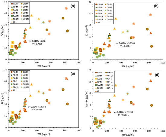 TSP correlation with (a) OC, (b) EC, (c) TC, and (d) soot-EC in all sites and periods of monitoring in Sultan Alauddin Street, Makassar city, South Sulawesi, Indonesia. Description: PA, GR, PP, UP: sampling site; M: morning; N: noon; LN: late noon.