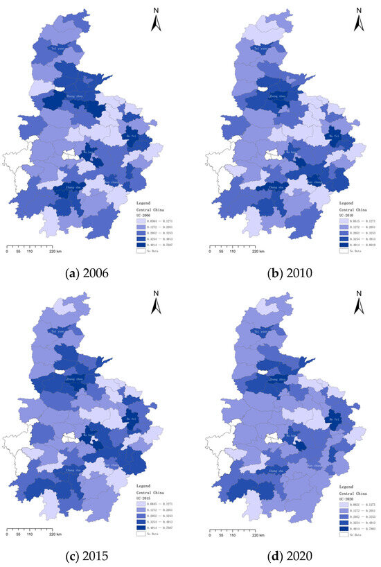 Between 2006 and 2010, there was a noticeable increase in the number of upper-middle and high compactness cities, particularly concentrated in the Wuhan urban agglomeration, the Chang–Zhu–Tan city cluster, and the Poyang Lake city cluster. From 2010 to 2015, not only was there an improvement in the urban compactness across the entire central China, but the disparity in compactness between cities also began to narrow. The north formed a major agglomeration of high compactness centered around Taiyuan and Zhengzhou, while the south saw the formation of a high compactness urban distribution belt along the Hefei–Nanchang–Wuhan–Changsha line, with the compactness index gradually decreasing from these centers. During the 2015 to 2020 period, the spatial distribution of the compactness index remained relatively stable. However, influenced by the sudden major public health event of COVID-2019, the socio-economic statistical data for central China in 2020 were generally lower, leading to a lower measurement of urban compactness for that year. Nonetheless, based on the development trend of existing measurements, it can be inferred that the urban compactness index for central China continued to hold a steady and rising state from 2015 to 2020.