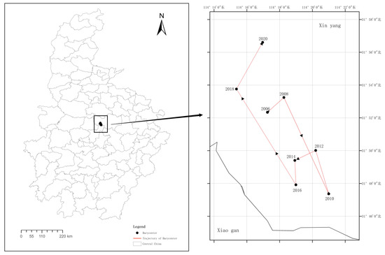 Figure 3. The barycenter of urban compactness is situated at the geographic coordinates of 114.16~114.20° E and 31.58~31.46° N. It operates within the geographical limits of Xinyang City in Henan Province and Xiaogan City in Hubei Province.