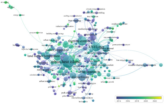 The Journal Citation Reports (JCR) provides a standardized classification system for research publications. This study identified four subject categories: Environmental Science, Engineering, Earth and Planetary, and Social Science. The database was used to analyze manuscripts’ key concepts and the network visualization with the VosViewer tool [45]. The concepts with the most occurrences on the topic, their interconnections, and their evolution pattern from 2014 to 2023 are illustrated in Figure 2. The graphic shows the links of six principal keywords used in the literature in 2018: urban heat island, ENVI-met, thermal comfort, urban vegetation, microclimate, and land-surface temperature (LST).