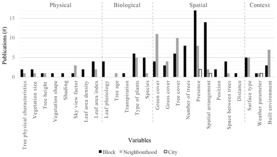 In experimental studies, researchers have altered spatial factors (19, 48.7%). It is important to comprehend the influence of vegetation’s spatial configuration on temperature reduction. At this scale, mixed variables have been altered (15, 38.5%), while physical, contextual, and biological variables are sporadically analyzed, as demonstrated in Figure 4.